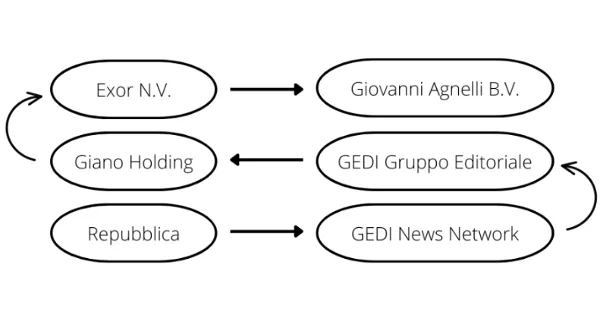 Exor NV group and the Agnelli family (one of the oldest and most powerful families of Italian entrepreneurs) represent another sample of the complexity of ownership chains in Italy. Exor indeed owns – in addition to the already mentioned Repubblica – other Italian newspapers and media outlets, such as La Stampa and Il Secolo XIX, through the same Gedi group. Some radio outlets (such as Radio Deejay and Radio Capital) and magazines (National Geographic, Limes) also belong to different editorial companies that Gedi ultimately owns.