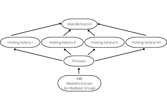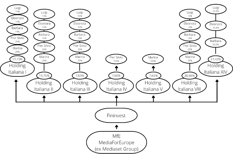 Compared to the 2023 EurOMo Report, the chain of sub-holdings that characterizes the Italian media ownership system remains largely in place and, in some cases, has become even more complex. This is due to both the emergence of new players and to the reorganization of established ones. The death of Silvio Berlusconi in 2023, for instance, led to the redistribution of Fininvest shares among his five heirs – Piersilvio, Marina, Eleonora, Barbara, and Luigi – further complicating the ownership structure of the group.